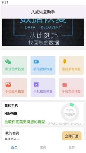 先安裝八戒恢復助手并打開它,在首頁界面,你既可以使用微信圖片、視頻、語音的恢復功能,也能夠還原手機里的照片、文檔以及本地視頻。