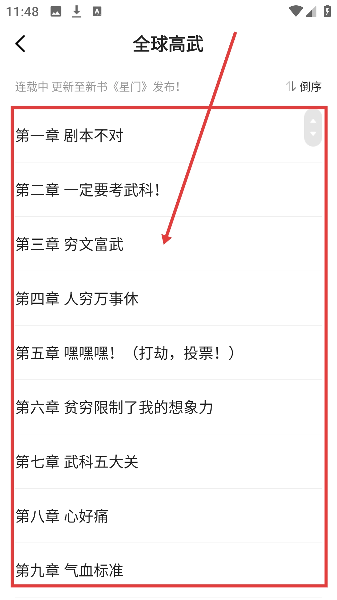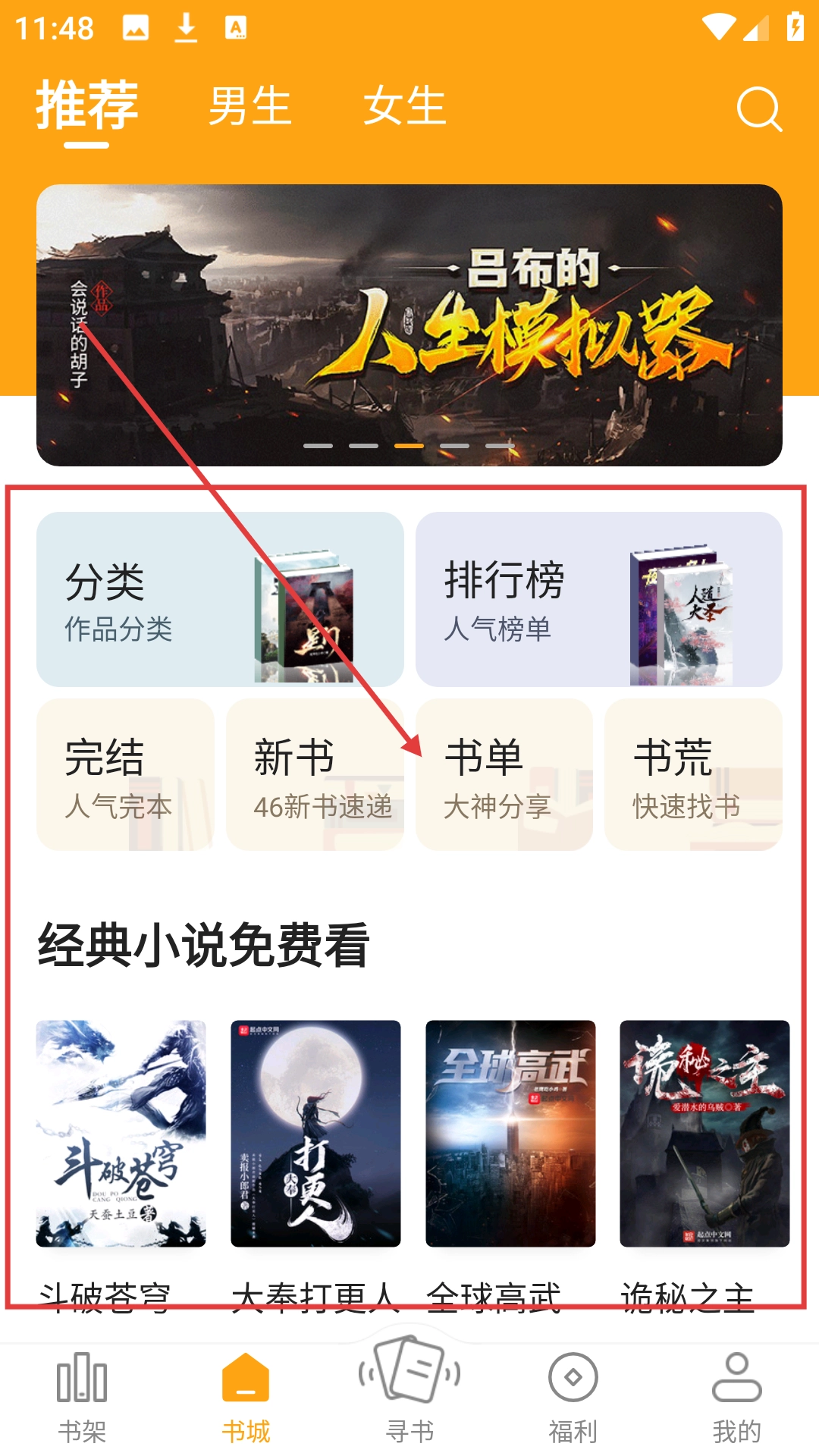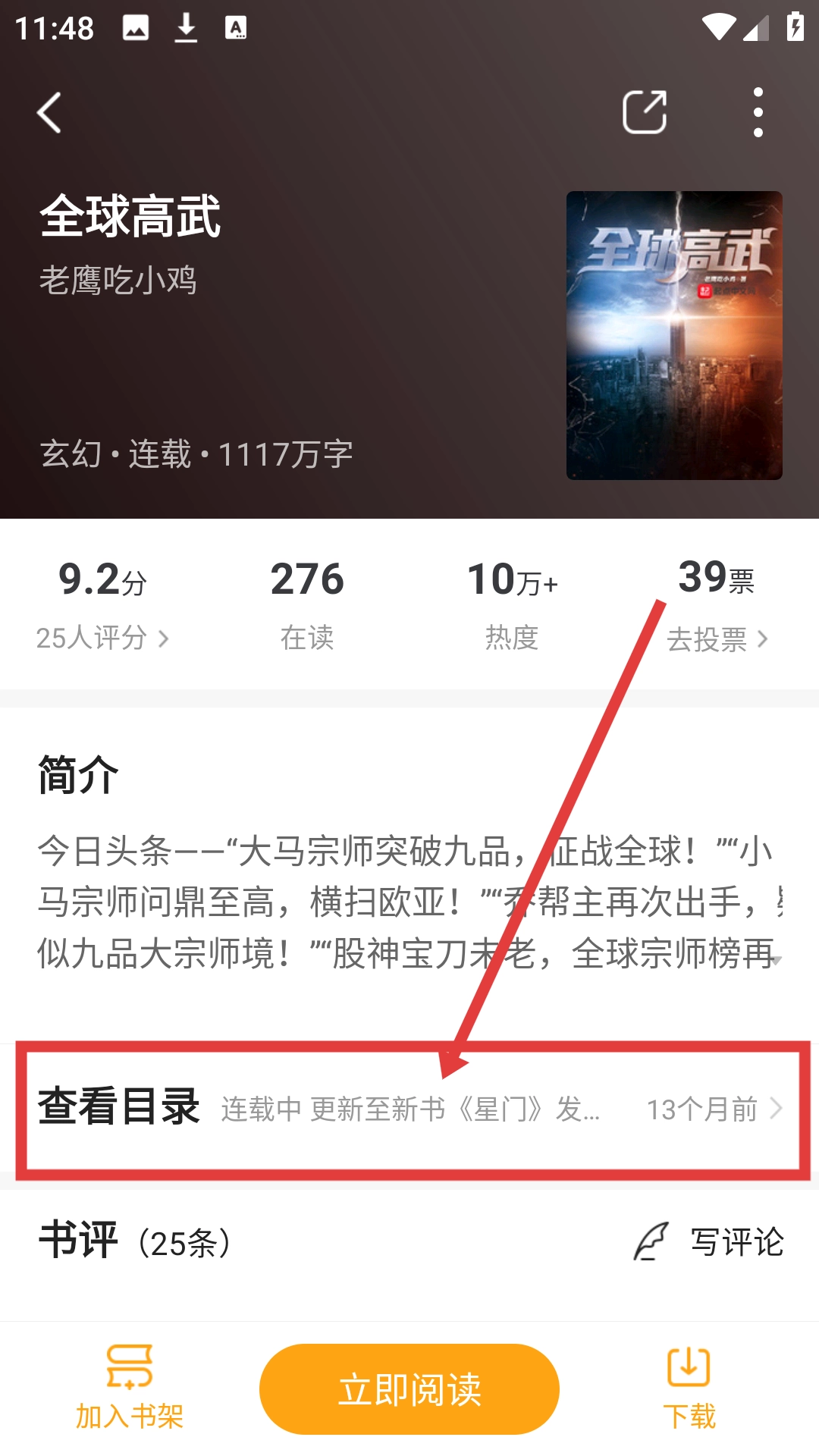 在書(shū)城挑選自己感興趣的小說(shuō),比如《全球高武》這類(lèi)作品,然后點(diǎn)擊進(jìn)入小說(shuō)的詳情頁(yè)面就可以啦。