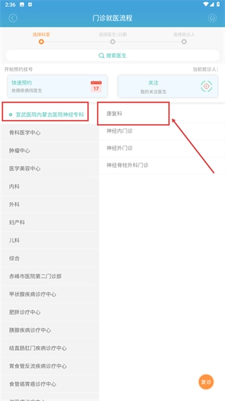 在科室選擇頁面,首先選定具體醫院(例如“宣武醫院內蒙古醫院神經專科”),接著選擇想要的目標科室(例如“康復科”),隨后就能進入該科室對應的醫生列表頁面。