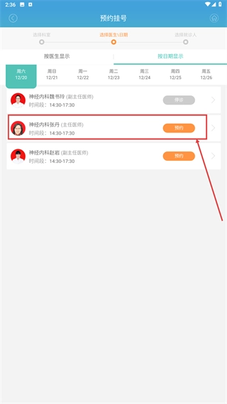 在醫生列表頁面選定目標醫生(例如“神經內科張丹”)后,點擊對應醫生旁的【預約】按鈕,即可跳轉至該醫生的號源選擇界面。