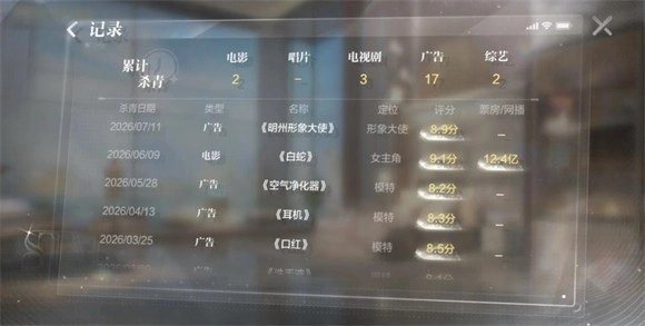 拒絕夏蕭因合作;廣告與綜藝資源前期應優(yōu)先追求數(shù)量積累,后期則需在確保高星評級的基礎上再提升數(shù)量;在第二年金曲獎落幕前,切勿結(jié)束唱片類通告的錄制;整個檔期內(nèi),電視劇項目數(shù)量不超過4個,電影項目數(shù)量不超過4個,廣告與綜藝的數(shù)量可靈活安排;電影方面,《白蛇》《霧港蝴蝶》《永眠香》這幾部作品的分成收益較高,但由于數(shù)量限制無法全部接下,可考慮拒絕其中一部的男主角色;當人氣達到一線水平后,參與五星通告的分成比例將提升至20%;若能將《永眠香》和《霧港蝴蝶》的拍攝表現(xiàn)刷至全完美級別,可獲得四千多萬元的收益。