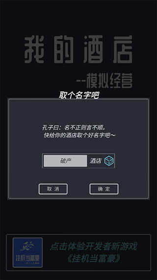 進去之后記得要先給我們酒店取一個響亮的名字,畢竟孔子都說了名不正則言不順,大家可以參考一下小編的取得破產酒店。