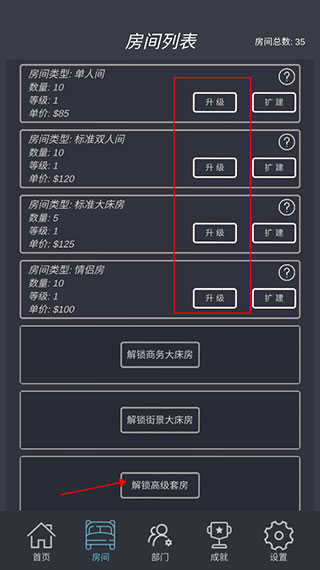 要是游戲里沒客人愿意住咱們酒店,那就選升級房間或者解鎖商務大床房吧。等高級房間解鎖后,就能吸引不少高級客人來入住了。