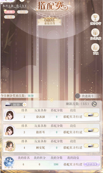 搭配賽需通過劇情5-2解鎖,每周都會更新不同的主題與風格要求,小主得依據主題搭配出最契合的套裝,以此獲取更高的搭配分數。要是搭配出了滿意的套裝,就可以和其他小主進行PK,通過提升排名來證明自己的搭配是最出色的。參與戰斗還能獲得靈感心貝,這些心貝可在商城兌換精美的服飾。