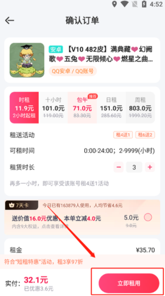 最后在商品詳情頁,挑選合適的套餐,點擊“立即租用”按鈕就可以了。