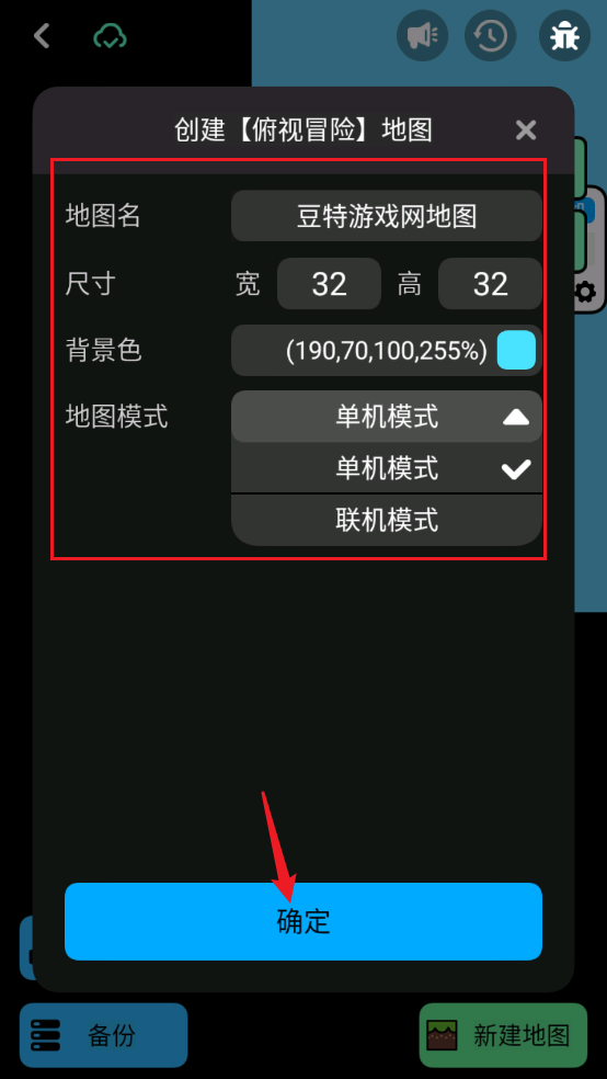 進入后填寫地圖名稱,選擇尺寸、背景和地圖模式,然后點擊“確定”按鈕。