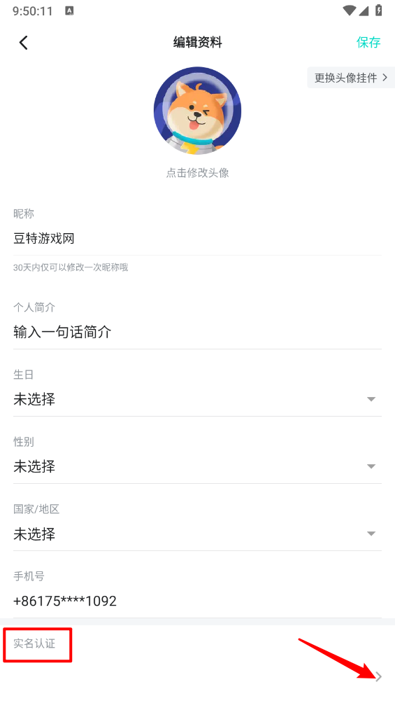 滑動到最底部實名認證欄目點擊右邊的箭頭所指圖標。