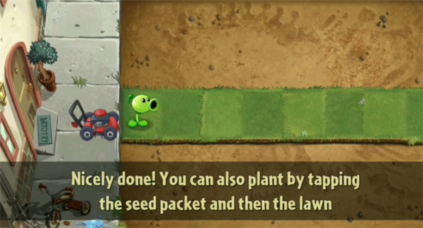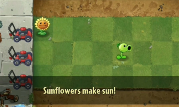 首次進入游戲時,會觸發一個新手教程,只需簡單點擊操作,即可開啟闖關模式。在闖關過程中,需要直接種植豌豆射手,每次種植需消耗100點陽光。