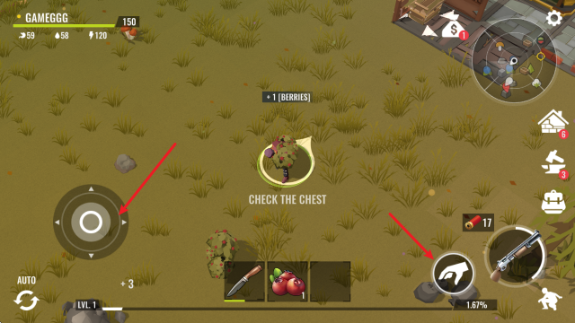 進入游戲后,借助左側的搖桿來控制移動,當靠近物品時,點擊右側的小手圖標就能完成資源采集。
