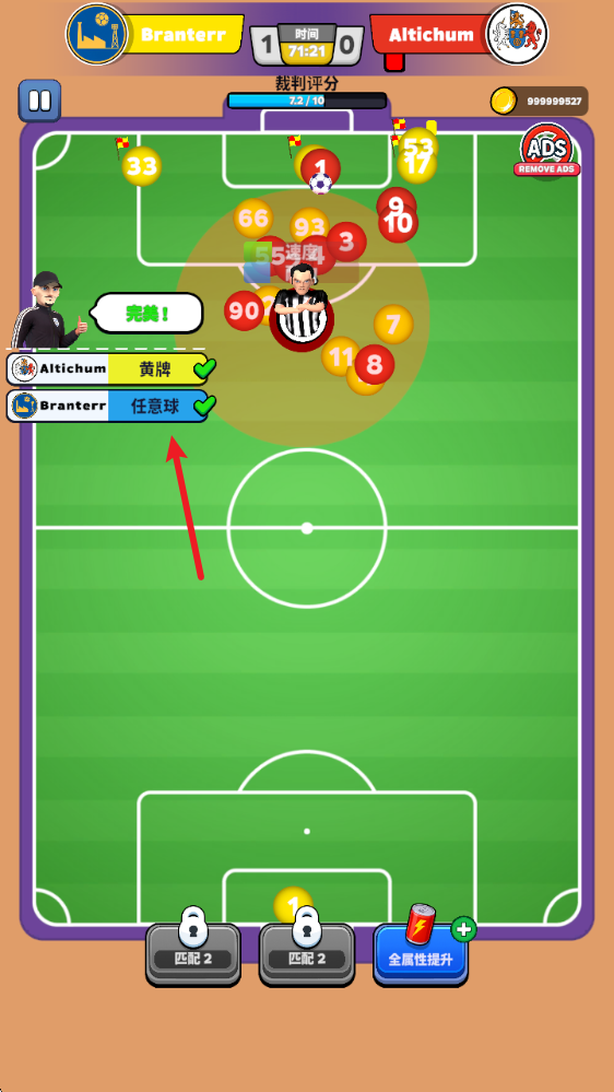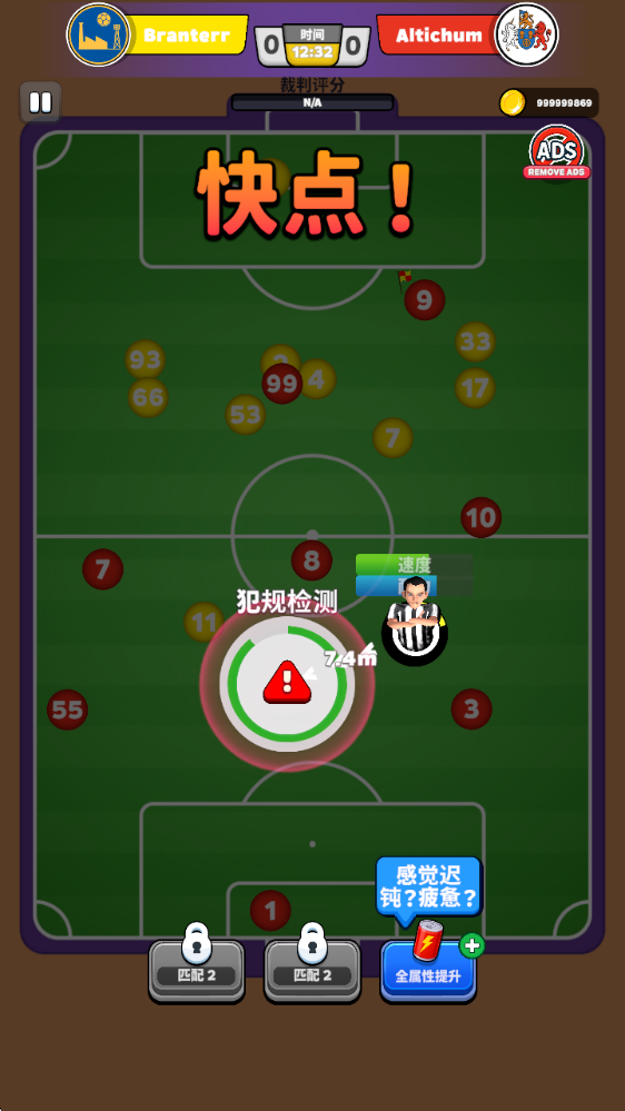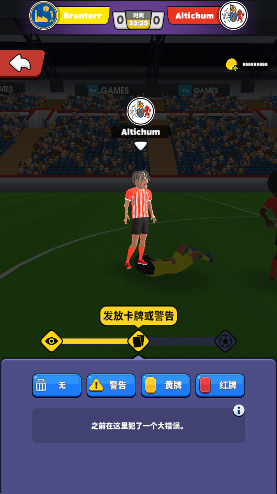 開球之后,拖動屏幕來操控裁判移動,一旦出現如圖所示的警告提示,就需要迅速靠近以執行判罰。