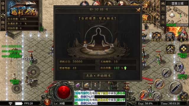 輪回轉生:當等級達到48級后,可消耗元寶與天地精華來提升此系統等級,每提升一級都能增加攻擊倍數。