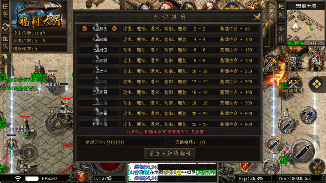 加官進爵玩法:通過消耗元寶與天地精華來實現進階,每提升一級不僅可以增強攻魔道屬性,還能提高自身的防御力和生命值。