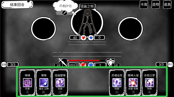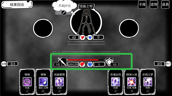 玩家生命值歸零即判定失敗,此處展示玩家的基礎屬性,具體為:[血量/護盾]→用于抵御傷害,[護盾]→每回合結束后會重置為空,[力量]→可提升卡牌的攻擊效果,[耐力]→能增加卡牌帶來的護甲值。