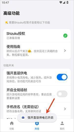 若要開啟直驅供電功能,需用戶通過Shizuku授權完成激活操作。