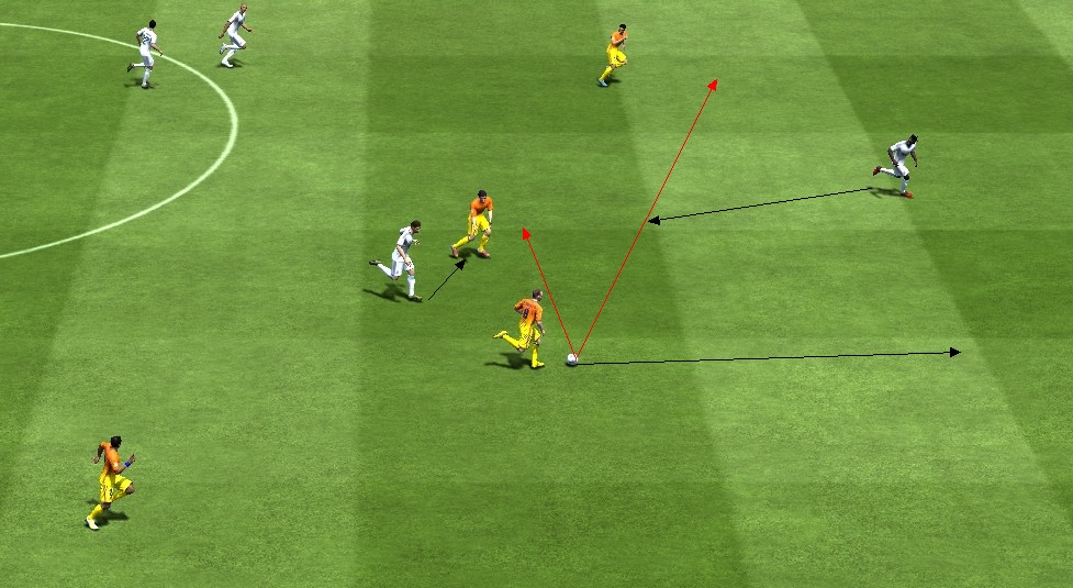 圖中電腦伊涅斯塔跑動(dòng)路線為超前,共有兩條路線可以選擇傳球。因?yàn)橹虚g的隊(duì)友可以讓我方電腦進(jìn)行協(xié)防,則我控制的球員需要做出兩個(gè)防守動(dòng)作。