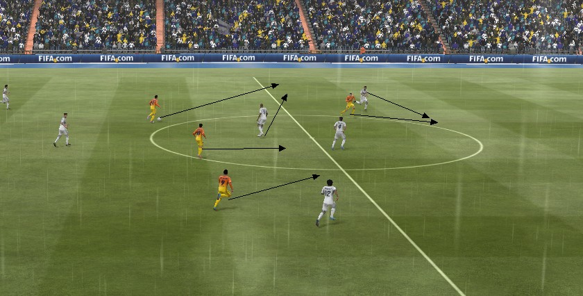 圖 中帶球的巴薩球員可穿的點(diǎn)很多身旁至少有3個(gè)出球點(diǎn),但其中只有一個(gè)才是最致命的,就是右邊這個(gè)紅線,而下面那個(gè)紅線因?yàn)榕迮搴桶㈨f羅亞已經(jīng)雙人在防,所 以即使球傳到那個(gè)點(diǎn),電腦要直接突破射門也是很難的,所以其實(shí)電腦最有可能出球的就是上面的這個(gè)點(diǎn),雖然上面看似有我方有三個(gè)防守球員,但是身后的空檔才 是最最危險(xiǎn)的,這個(gè)時(shí)候直接放帶球的,而去補(bǔ)身后的空檔。操控的是拉莫斯。