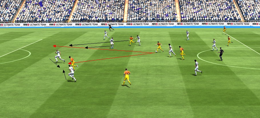 左面跟防的是電腦,利用RB進(jìn)行協(xié)防,右邊補(bǔ)中后衛(wèi)缺位的是埃辛,由我來(lái)控制。