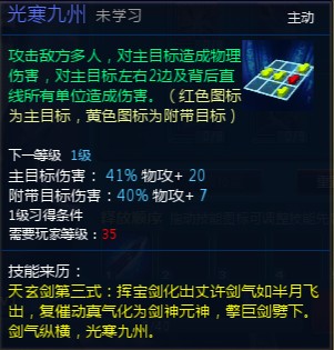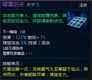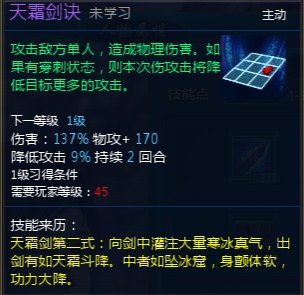3、天霜劍三式,傷害高,而且三個技能有輔助的關系。最關鍵的是這三個技能造成高傷害的同時減少敵人的攻擊并增加自己攻擊,典型的損人利己。后期必學滿的節奏。