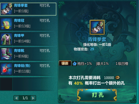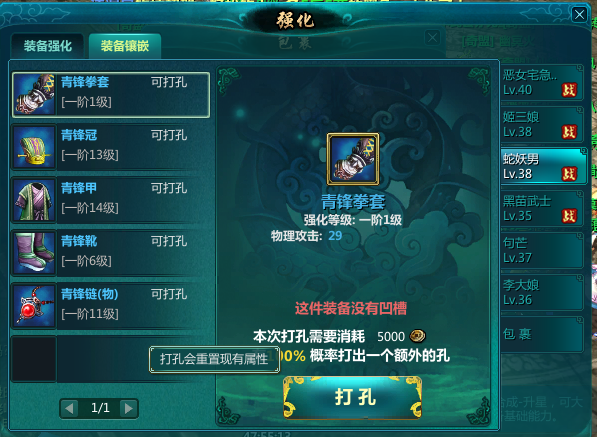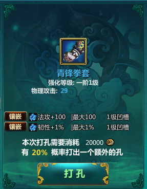 想要裝備牛逼,得先打孔,第一次打孔是5000紋銀。好像是38級開啟此功能。