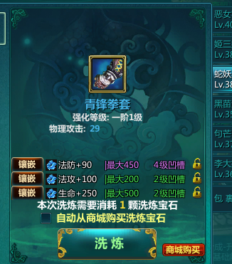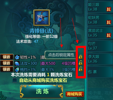 這里是裝備屬性鎖定的。有錢老板可以都換成5級凹槽,打牛逼石頭哈。裝備強化簡單介紹到這里。下面介紹下其他功能。