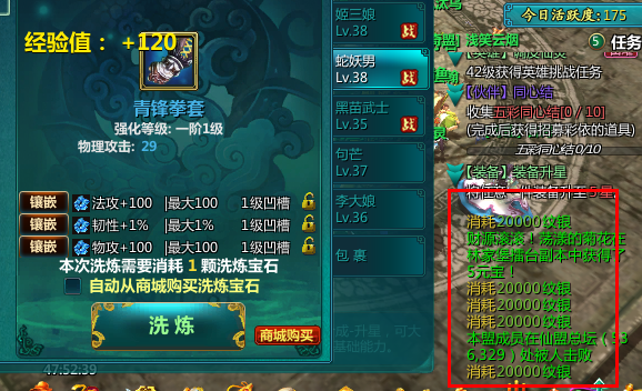 第三個孔只有20%成功,花銷掉我7次,一次是2萬紋銀啊。當有三個孔的時候,就需要洗練了。沒看到都是1級凹槽么?洗練是能洗出來5級凹槽的哦。