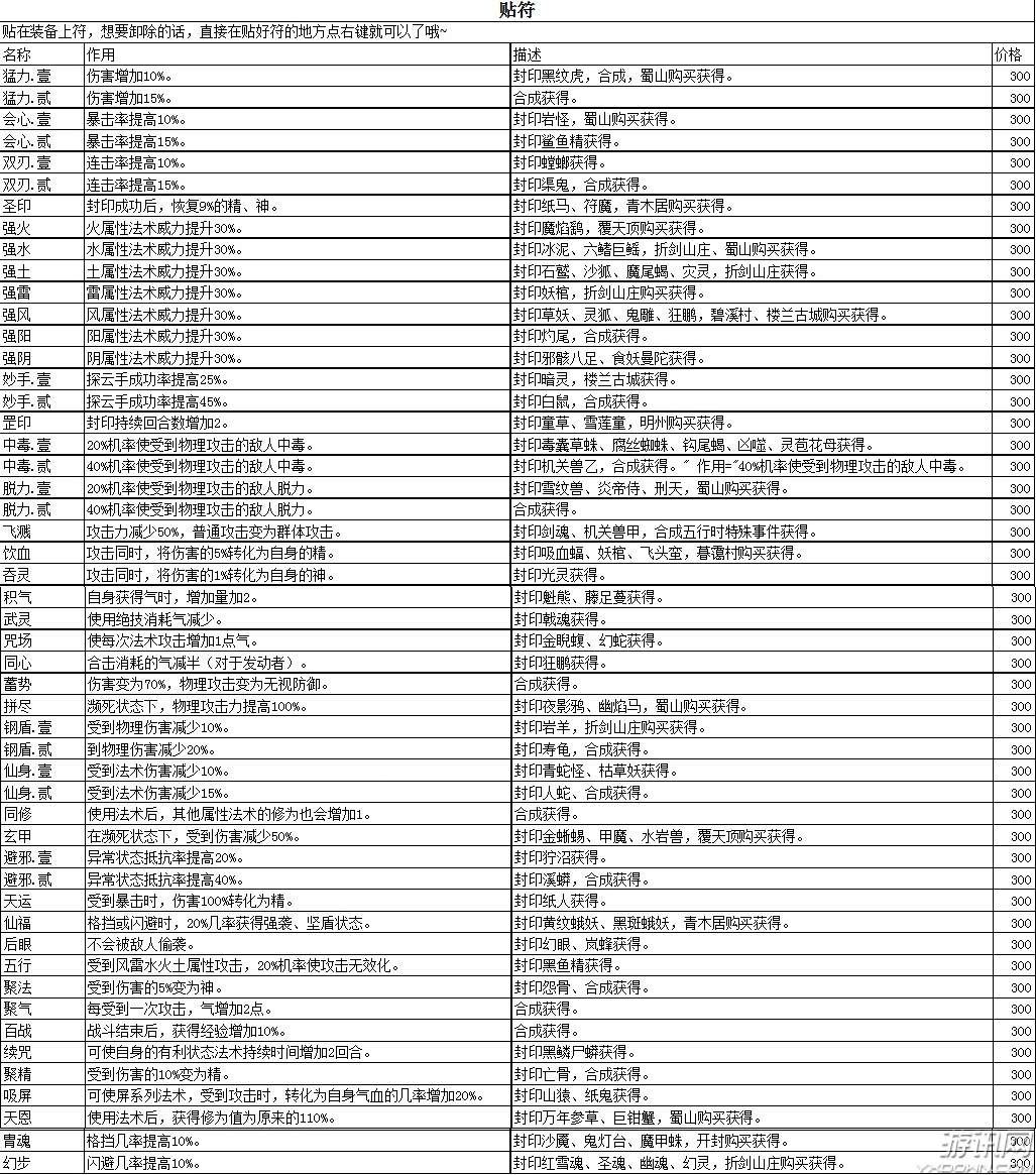 關于貼符,相信玩過《仙劍奇俠傳5》的玩家朋友們在熟悉不過了,沒錯,在前傳中,貼符系統和仙劍5是一模一樣,不過新增加了一些符文,下面就為玩家帶來一張表,詳細介紹各類符文效果,一起來看看吧。