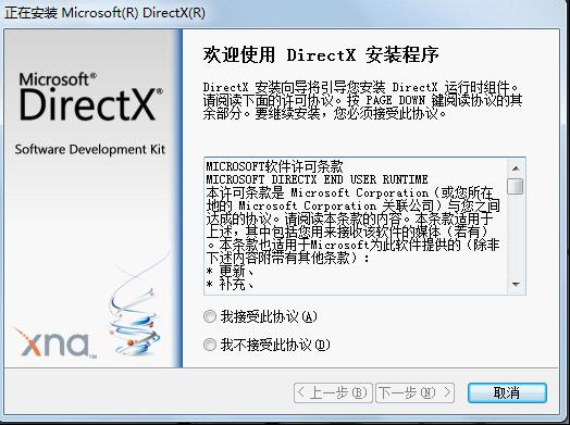 安裝完畢后,將提示您安裝DirectX,如果您確認您已安裝過Dx9.0c及以上版本,您可以選擇取消; 強烈推薦您安裝以確保《仙劍奇俠傳五前傳》的正常運行。選擇”我接受此協議“并點擊"下一步"按鈕
