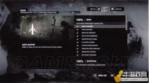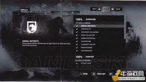 在地圖界面按次武器鍵會看到你購買過的技能。技能分為三類:生存,肉搏,狩獵。在這里你可以詳細(xì)地看到還有什么技能沒有獲得。每個技能的細(xì)節(jié)將在后面的技能篇討論。