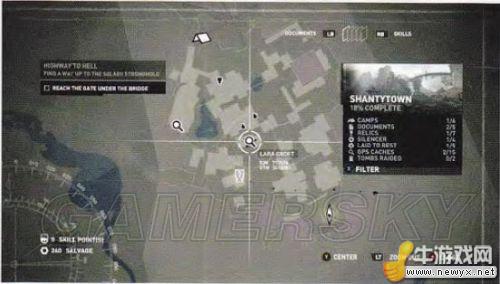 打開菜單可以看到地圖和任務(wù)目標(biāo),并且會顯示自己的位置。在當(dāng)前地帶搜集要素的完成度,和你當(dāng)前的任務(wù)目標(biāo)。左下角會顯示技能點數(shù)和物資點數(shù)。