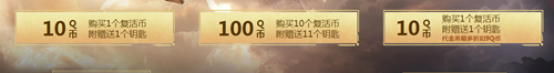 10Q幣購(gòu)買復(fù)活幣1個(gè)并贈(zèng)送1個(gè)鑰匙,100Q幣購(gòu)買復(fù)活幣10個(gè)并贈(zèng)送11個(gè)鑰匙;擁有代金券的玩家,可以使用代金券抵扣購(gòu)買復(fù)活幣并贈(zèng)送鑰匙,一次最多抵扣9Q幣,一旦代金券支付完成后無(wú)法退還(下單后未支付,訂單被系統(tǒng)取消之后或手動(dòng)取消之后會(huì)返還抵扣的代金券)