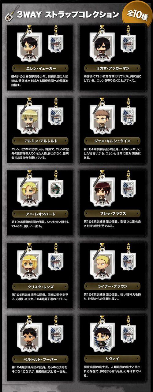 這個小掛件以作品中的主要角色的Q版為圖案,不僅可以當(dāng)掛件用還能用來插耳機孔或是當(dāng)小裝飾。款式有艾倫、三笠、阿明、利威爾等10人。