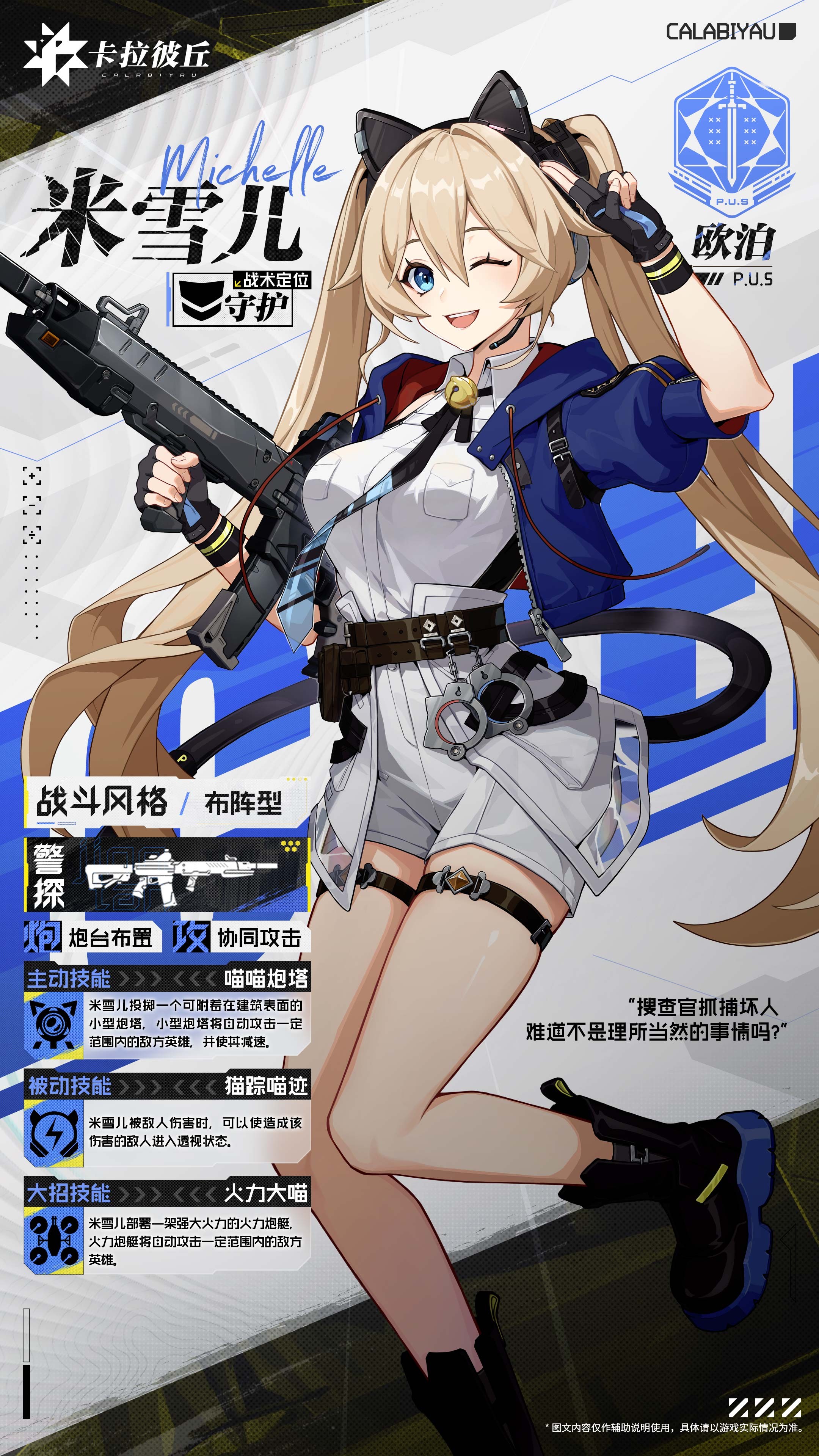 米雪兒是小編認為在首充中一定要選擇的角色之一,她的主動技能喵喵衛士可以直接在自己所在的區域內部署上喵喵衛士,會對進入射程范圍內的敵人自動開始射擊,且附帶有減速的效果,貓蹤喵跡這個被動技能則能夠讓米雪兒擁有短暫的透視能力,不過要自己被敵人的槍械命中時才能觸發哦,火力大喵這個終結技能可以直接部署火力炮艇,對范圍內的敵人進行自動攻擊。