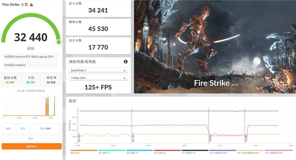 顯卡性能方面,RTX 5060筆記本電腦GPU作為入門(mén)級(jí)顯卡,整體性能還是相當(dāng)能打的。3DMark Time Spy圖形分12445,F(xiàn)ire Strike圖形分34241,應(yīng)對(duì)日常游戲沒(méi)有任何問(wèn)題。