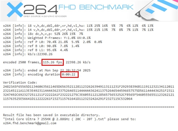 視頻編碼也是酷睿Ultra 7 255HX平臺(tái)時(shí)常會(huì)遇到的應(yīng)用場(chǎng)景,x264 Benchmark測(cè)試可以看到,完成2500幀編碼僅耗時(shí)22秒,編碼幀率高達(dá)115.26fps,效率出色。當(dāng)然,視頻編碼一直以來(lái)都是英特爾酷睿處理器的強(qiáng)項(xiàng),酷睿Ultra 7 255HX依然保持了這一優(yōu)勢(shì),相對(duì)友商平臺(tái)來(lái)說(shuō)更適合做視頻內(nèi)容生產(chǎn)力平臺(tái)。