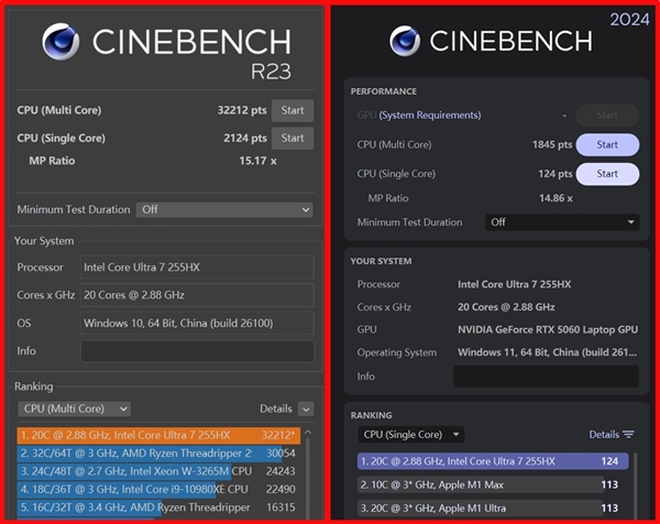 處理器方面,CPU-Z單核得分839.2,多核得分14245.2,總體性能釋放不錯(cuò)。CINEBENCH R23單核得分2124,多核得分32212;CINEBENCH 2024單核得分124,多核得分1845。從跑分可以看出機(jī)械革命耀世16 Ultra的性能調(diào)校還是相當(dāng)不錯(cuò)。