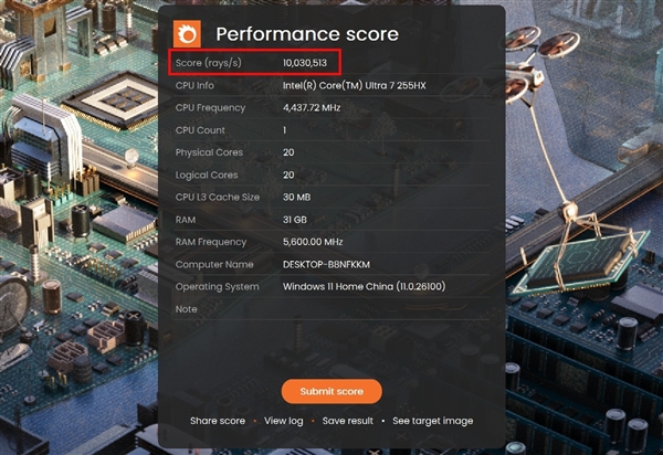 接下來(lái)參考Corona 10渲染器的Benchmark測(cè)試,可以看到1分鐘渲染光線速度達(dá)到了10030513rays/s,同樣是有著不錯(cuò)的性能表現(xiàn)。