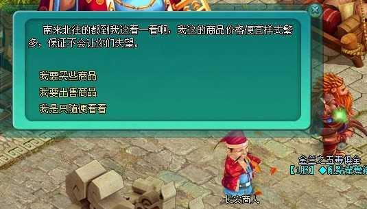 6、在地圖上找到商人(小地圖TAB鍵)點擊對話,點擊我要出售商品,查看物品的出售價格,如果出售價格高于你所購買的物品的價格,點擊出售,出售完物品后,再和商人對話點擊購買貨物。