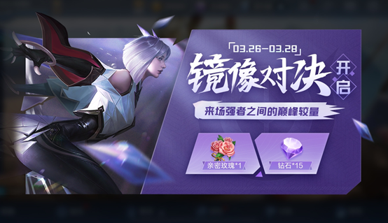 鏡像對決模式限時(shí)開啟,活動期間參與1局1v1鏡像對決即可領(lǐng)取親密玫瑰*1+鉆石*15。