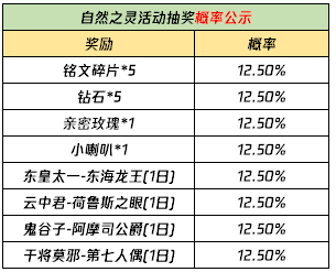 參與抽獎可隨機(jī)獲得下列獎勵(lì)之一:東皇太一-東海龍王(1日)、云中君-荷魯斯之眼(1日)、鬼谷子-阿摩司公爵(1日)、干將莫邪-第七人偶(1日)、小喇叭*1、親密玫瑰*1、銘文碎片*5、鉆石*5。