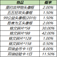 打開后可隨機(jī)獲得以下獎勵(lì)之一:里約吉祥物頭像框、五五狂歡頭像框、99公益頭像框(2019)、勝者為王頭像框、雙倍金幣卡:1日、雙倍經(jīng)驗(yàn)卡:1日、銘文碎片*158/128/88/58。