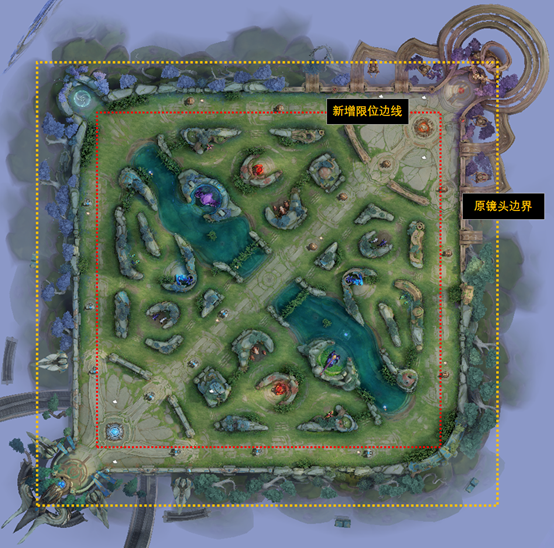 在向地圖邊界移動鏡頭時,常常會過度拖拽鏡頭移動到了地圖邊界之外,屏幕上大部分內容被與戰斗無關的地圖外風景占據,無法第一時間觀察到邊路。此次我們在地圖邊界內側新增了一圈“鏡頭限位邊線”,鏡頭位置觸碰邊線時會被限制在邊線內1秒,1秒后如果仍在繼續向邊線外移動鏡頭才會突破邊線。