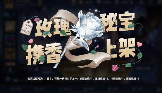 購買紅藍對決(1日),可額外隨機獲得以下之一:摯愛玫瑰*1(開啟每20次以內至少必得1個)、親密玫瑰*1、濃情玫瑰*1、濃情玫瑰*2