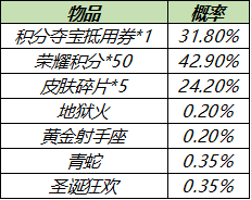 購買酷炫機甲(1日),可額外隨機獲得以下之一:地獄火、黃金射手座、青蛇、圣誕狂歡、榮耀積分*50、積分奪寶抵用券*1、皮膚碎片*5。
