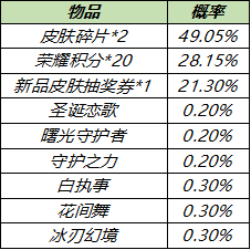 購買紅藍對決(1日),可額外隨機獲得以下之一:圣誕戀歌、曙光守護者、守護之力、白執事、花間舞、冰刃幻境、榮耀積分*20、新品皮膚抽獎券*1、皮膚碎片*2。