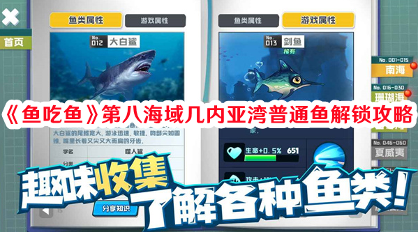 《魚吃魚》第八海域幾內亞灣普通魚怎么解鎖?這是一款吞噬進化類游戲,玩家需要在海洋當中不斷的進行吞噬才能讓自己得到進化,下面就來看看在不同海域當中,魚種的解鎖方式技巧。